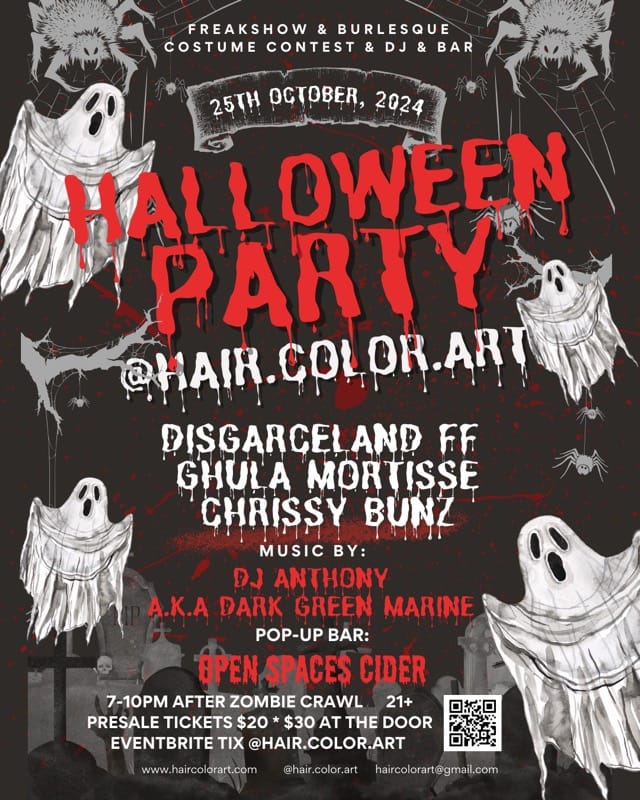 Join us at Hair • Color • Art after the Ithaca Zombie Crawl for a kick-ass Halloween party! Costume contest, raffle prize basket, sideshow freakshow performance, DJ , Open Spaces Cider Bar, Halloween themed treats, and Burlesque duo.